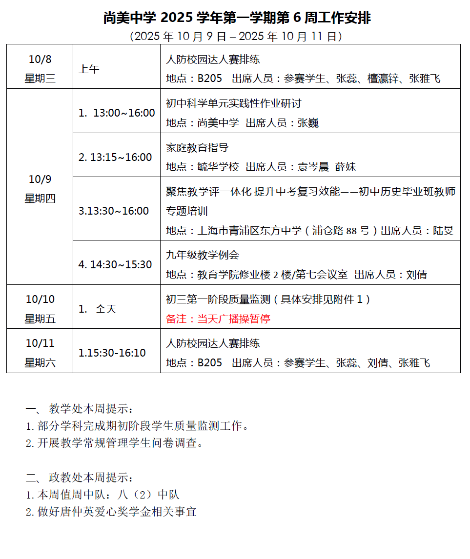 2025学年第一学期第6周工作安排