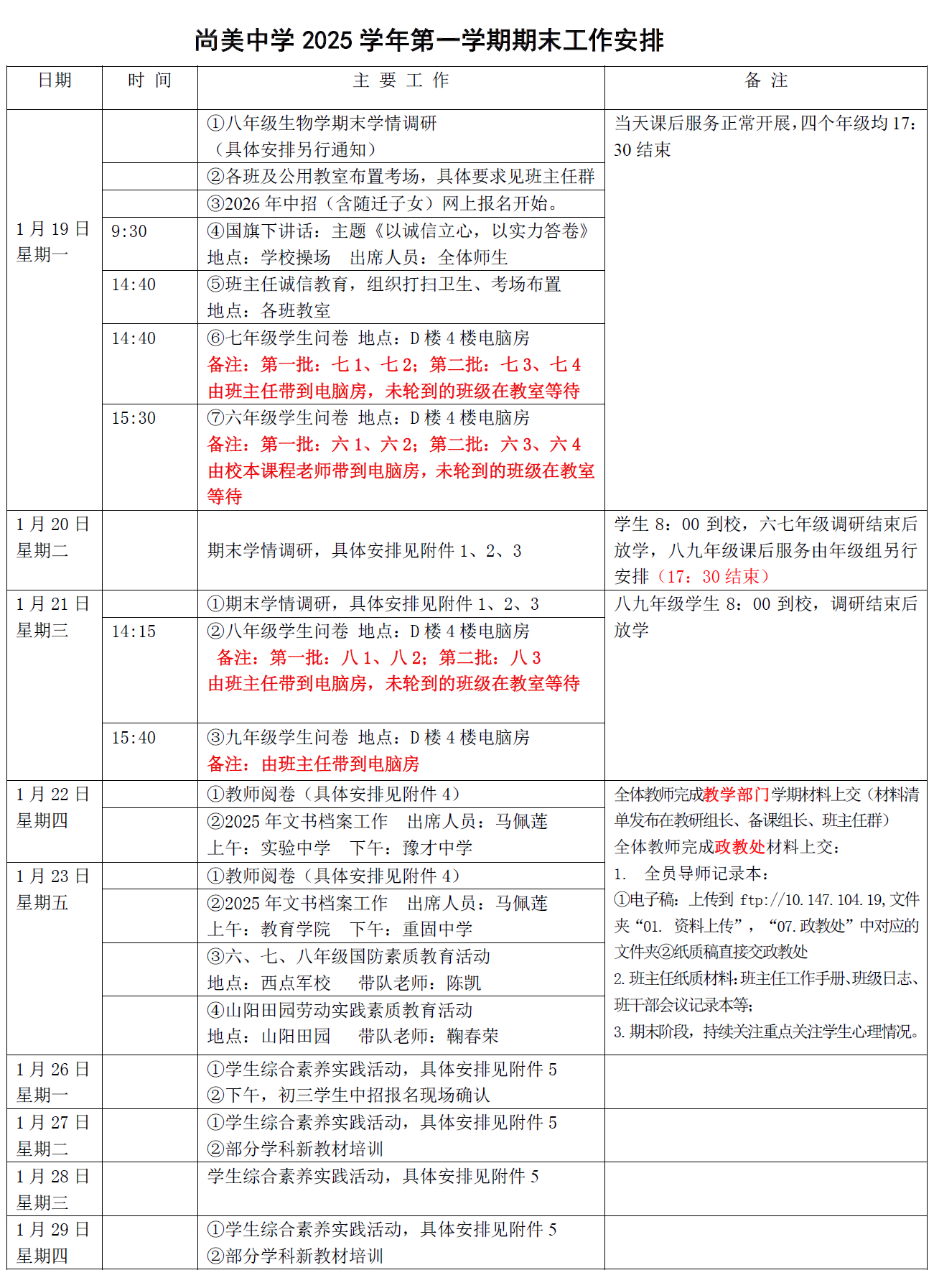 尚美中学2025学年第一学期期末工作安排